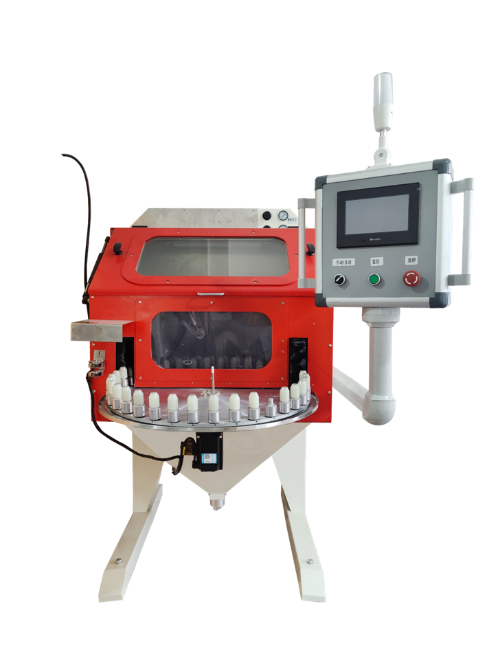 产品特点: 900*1300*1650(长*宽*高) 36个上料工位 公转加自转平台实现 360° 喷砂 过滤面积 1m² 喷枪 5mm